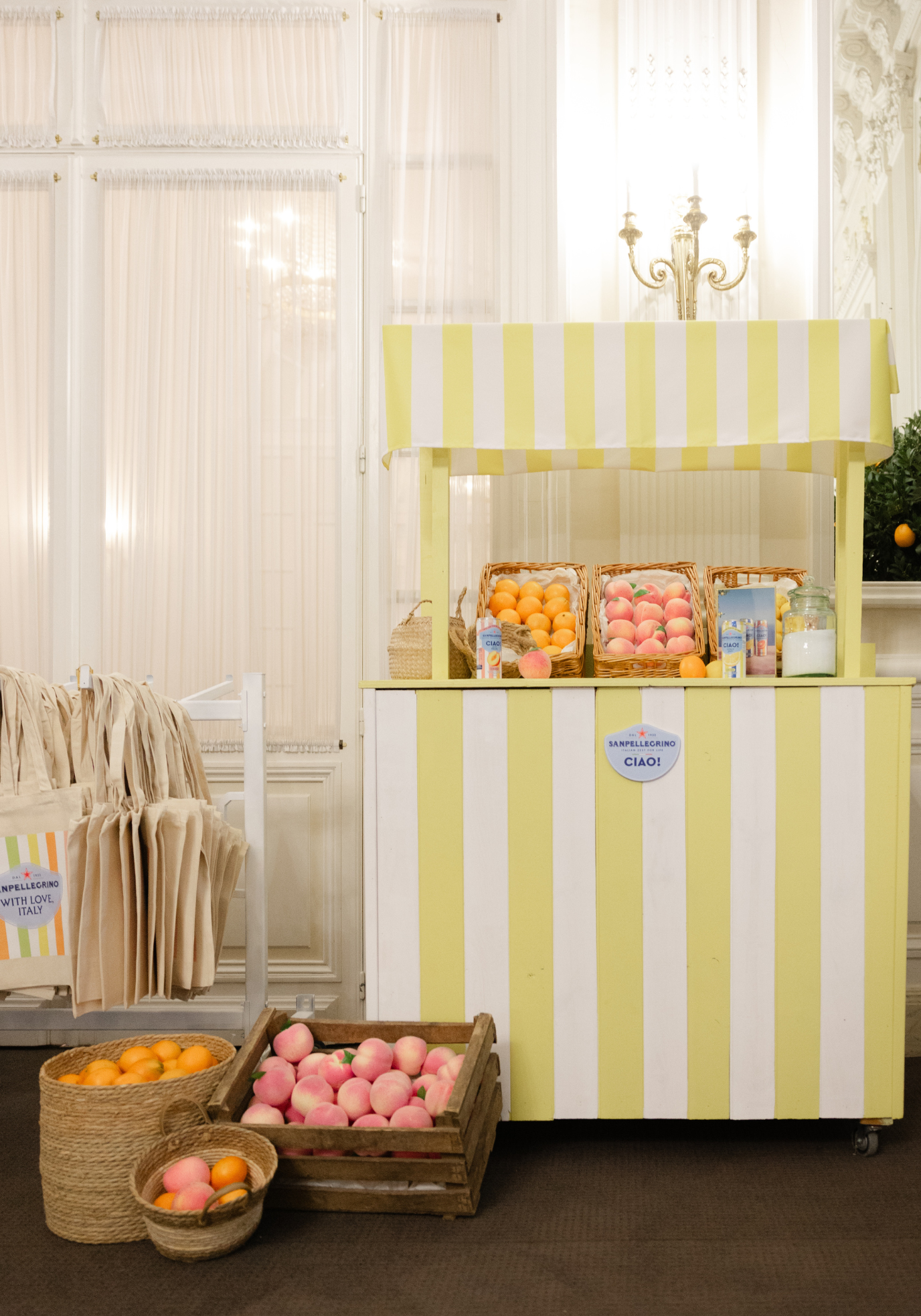 Fourni avec 6 paniers/caisses en bois remplis de fruits artificiels (citrons, pêches et cerises), ce bar crée une ambiance fraîche, colorée et ultra photogénique, parfaite pour une scénographie solaire et immersive.