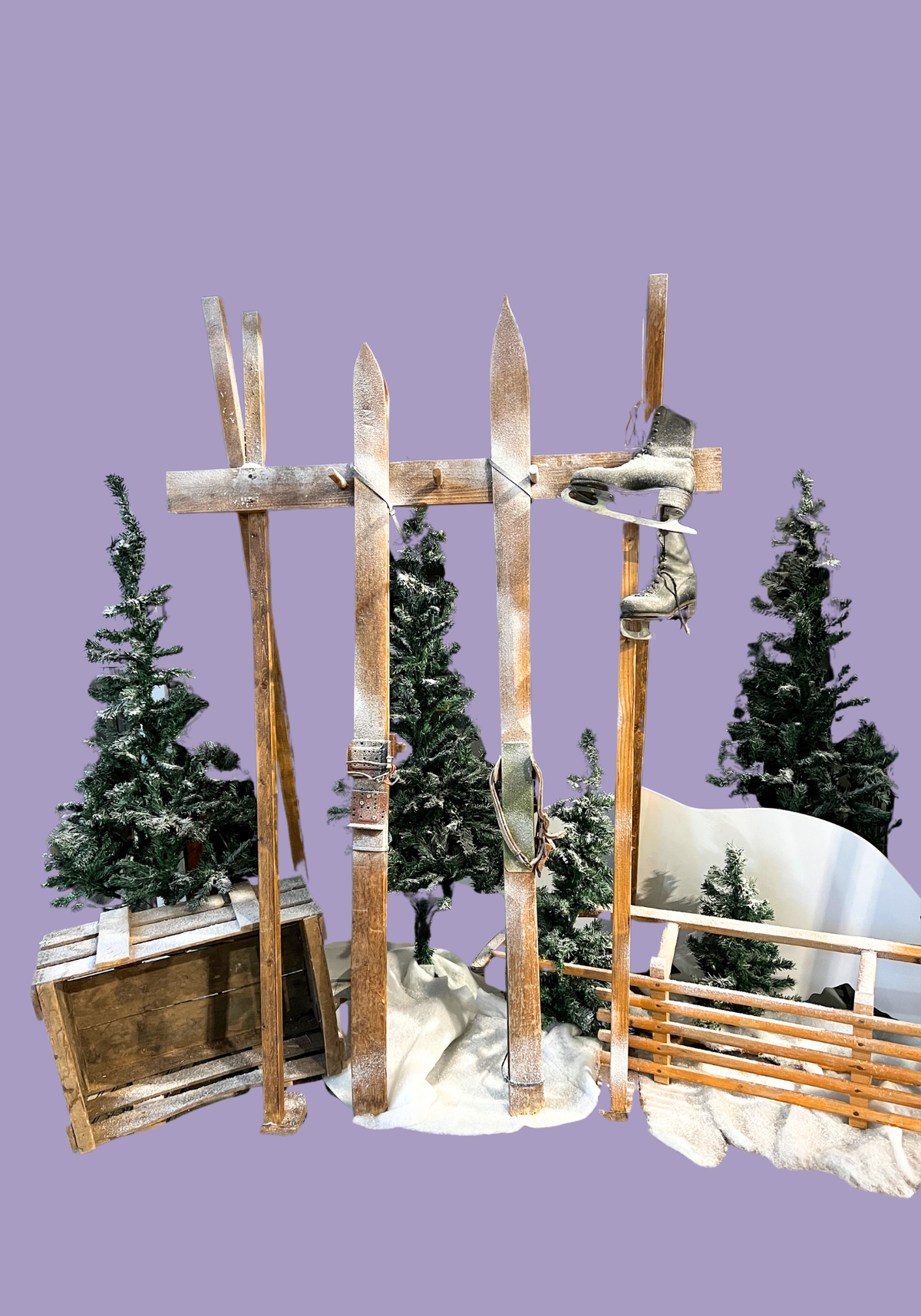 Luges vintage, skis anciens, panneaux de pistes de ski,
